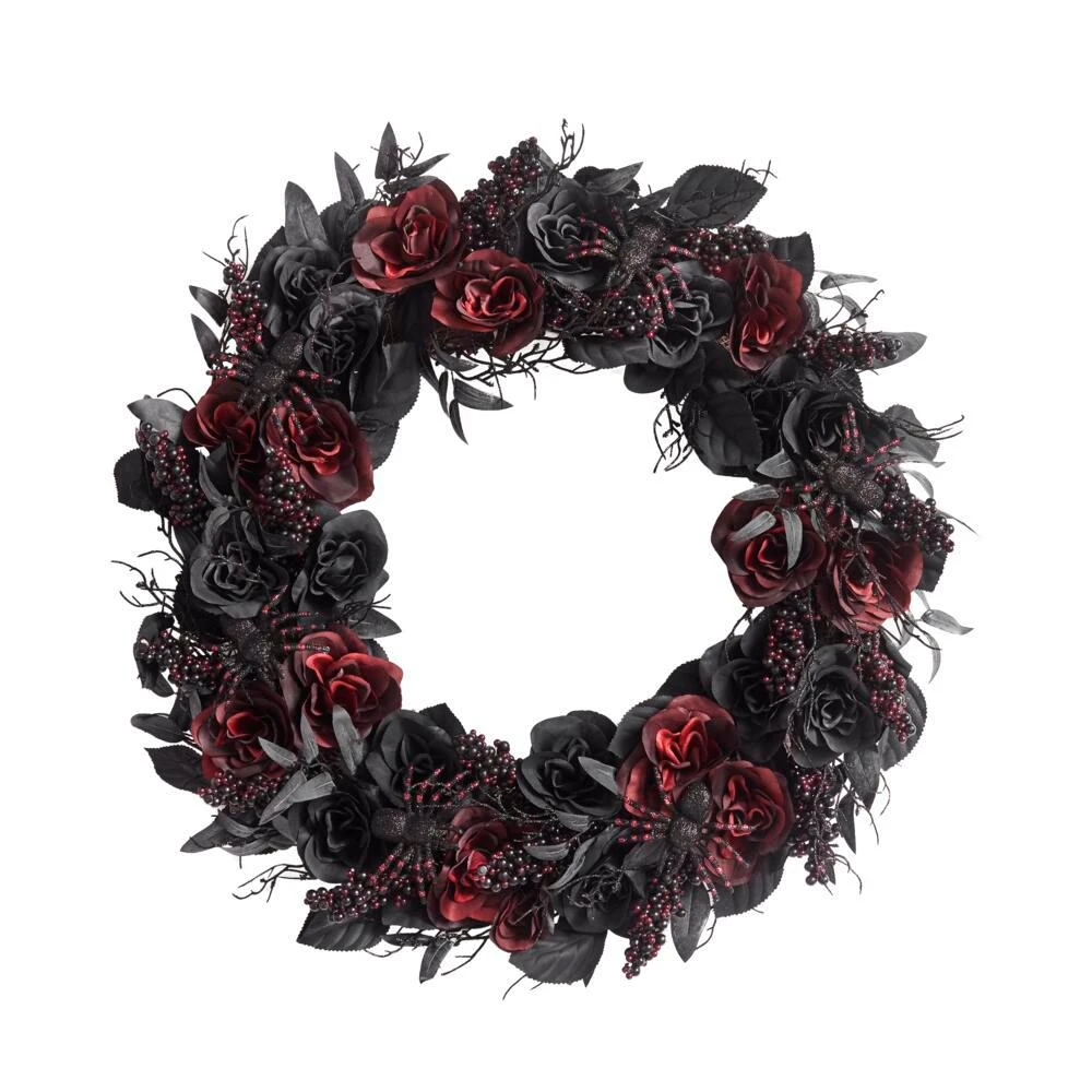 Achieve a festive Halloween mood when adding this 30-in. artificial rose wreath to your display. It is a mix of burgundy and black roses with spiders and black leaves. This decoration works well on your front door or mantel, and it can also be used as a unique centerpiece. The beautiful Halloween wreath is set on a natural twig base and can be easily stored.