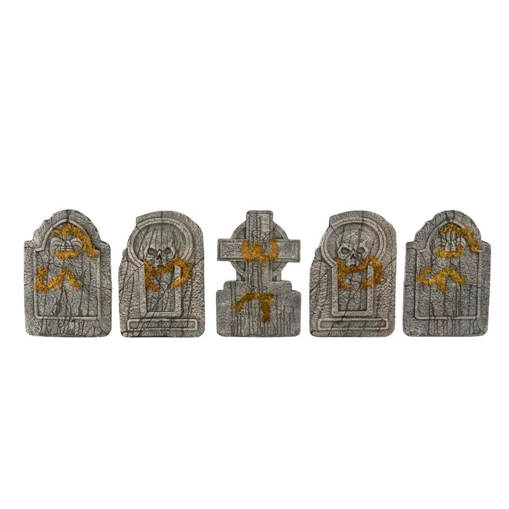 This pack of five 24-in. graveyard tombstones is an easy way to decorate your yard this season. Made from high-quality Styrofoam for lasting use, this Halloween decoration is sculpted in detail and with moss that looks like the real thing. It includes sturdy stakes to ensure stability.