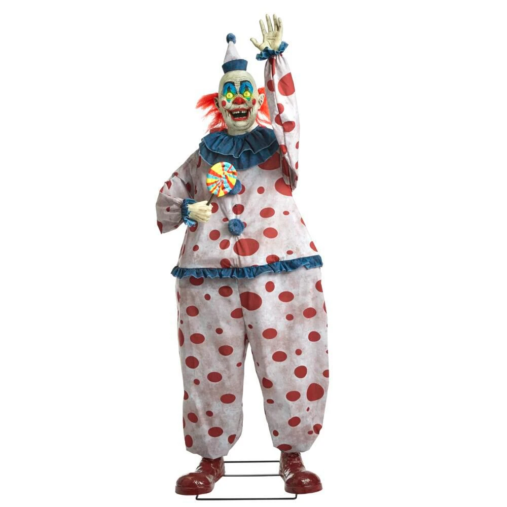 This Old Time Clown talks with moving mouth and waves his arm at you as he turns his head side-to-side. His eyes illuminate and he holds a detailed sculpted lollipop in one hand. Old Time Clown is activated by motion sensor and is ready to bring out the fun this Halloween.